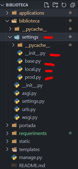 6. creamos la carpeta settings en la misma altura del archivo settings.py y dentro los archivos : base.py, local.py , prod,py y creamos el archivo __init__.py