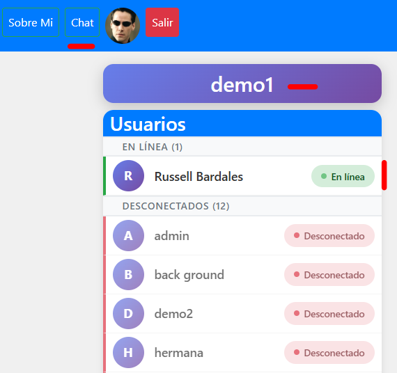 Podemos ver los usuarios en linea y los desconectados: