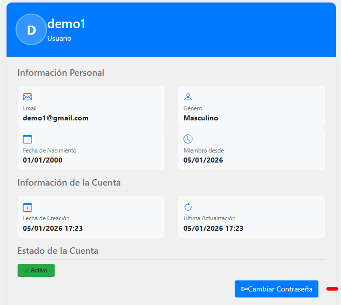 Nos aparece la opcion cambiar contraseña ya que es el mismo usuario el q esta viendo su propio perfil, si entraramos a ver el perfil de otra persona no saldria esa opcion.